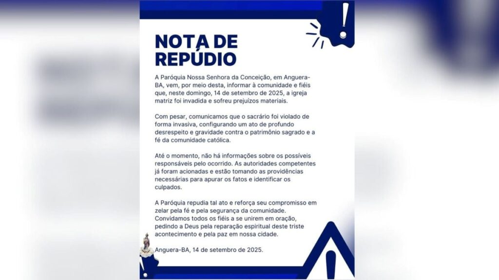 Em nota, a paróquia destacou: “Repudiamos tal ato e reforçamos nosso compromisso em zelar pela fé e pela segurança da comunidade. Convidamos todos os fiéis a se unirem em oração, pedindo a Deus pela reparação espiritual deste triste acontecimento e pela paz da nossa comunidade”.