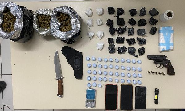 Após o cessar dos disparos, o suspeito, conhecido pelo apelido de “Gaguinho”, foi encontrado ferido. Com ele, os policiais apreenderam um revólver calibre 38 e uma mochila contendo drogas e diversos materiais. Entre os itens estavam mais de 1,5 quilo de maconha, 23 porções fracionadas da mesma substância e cerca de 50 porções de cocaína, incluindo pinos prontos para comercialização. Também foram encontrados aparelhos celulares, uma balança de precisão, lanterna, faca, coldre e outros objetos.